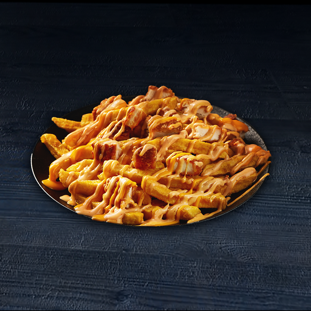 فرايز دجاج من مشاوي لفّه تجمع بين البطاطس الذهبية المقرمشة وقطع دجاج كرسبي وصوصنا المميز الغني بالنكهة،